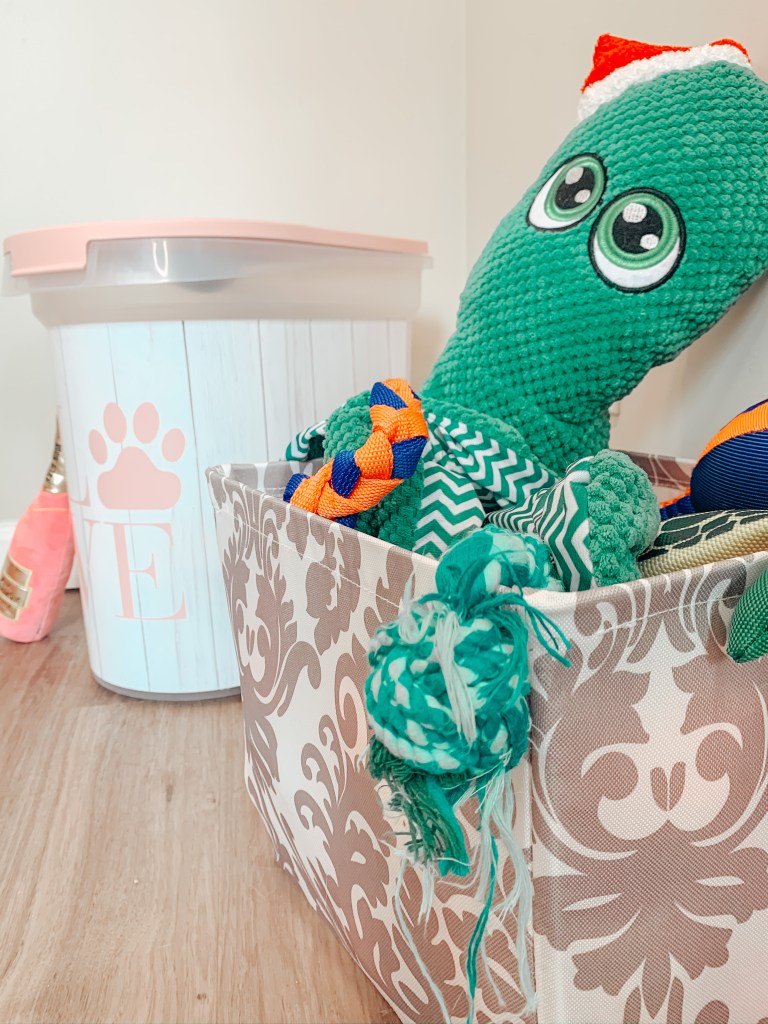 Next to her table, I put her food bowls with a mat underneath (she’s a water drooler) and a larger food bin that can fit a backup bag of food so we don’t run low. I was able to find all of these things between TJ Maxx & Homegoods. Bowls were $6.99 each, mat was $5.99 and her food bin was $16.99. In the corner, I placed a grey & white bin that I also found at Homegoods for $12 to hold all of her toys.