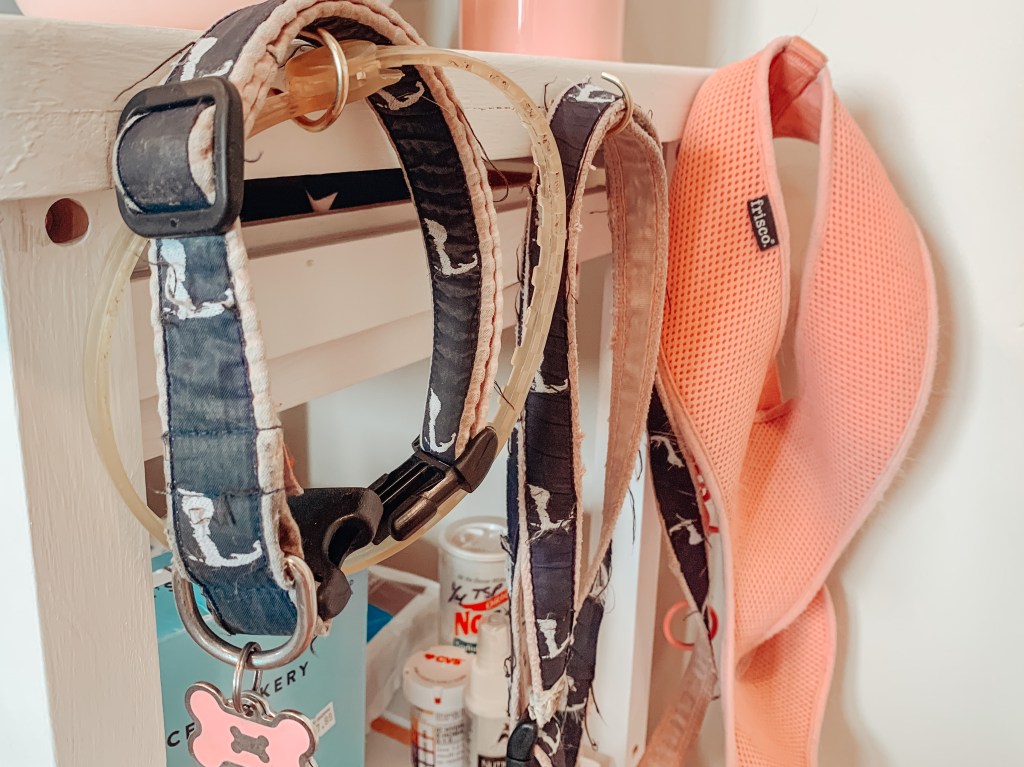 The first step was to bust out an old shirt & sweatpants, a paintbrush & can of white paint, lie down an old blanket, and get to work painting every inch of that cart being careful not to miss a spot. Once it had dried, I dragged it into my kitchen and screwed in four hook screws: three placed about an inch and a half apart on one side, and one solo screw on the opposite side. This was for her leash, collar, harness, and on the opposite side her puppy towel for the days when she comes prancing in with those adorable but muddy paws.