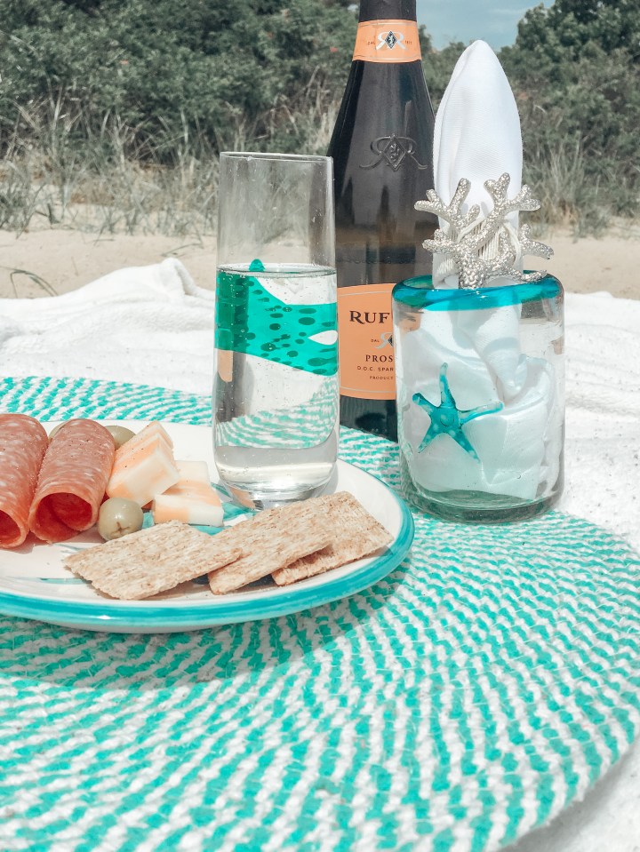 The theme we chose since our picnic would be seaside is..yup, you guessed it, nautical! We wanted to go with a very teal & beachy vibe, and luckily there are so many decor sales going on right now that this was easy and fairly inexpensive to accomplish. While everyone’s look can be completely different, here’s what we used to get that light and airy beachside vibe: